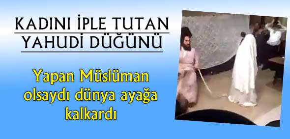 Yahudilerin kendine has düğün şekli. Kadının bağlı olduğu ipi elinde tutan adam atlayıp zıplıyor. Bunu yapan bir Müslüman olsaydı “kadına hayvan muamelesi yapılıyor” diye yaygara çıkartırlardı. Ama yapan yahudi olunca yahudi köpekleri sus pus oluyor.