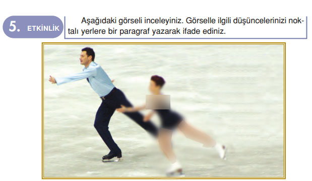 Çıplak bir kadın ve erkek patenle kayıyorlar. Çıplak kadının TÜRKÇE(!) ders kitabına koyulması ayrı bir skandal, karedeki subliminal mesaj ayrı bir skandal. Resim öyle bir açıdan veriliyor ki kadın (çok afedersiniz) eliyle erkeğin cinsel organına uzanıyor. (Resim öyle düşünmeye sevkediyor) Ve resmin çocuklar tarafından incelenmesi, bunun hakkında ne düşünüldüğü soruluyor.