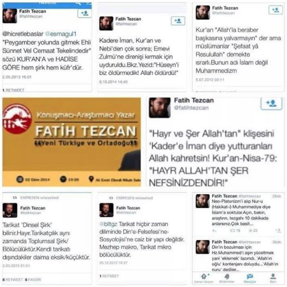 Gazetecilik ayağına fırsat bulduğu anda Ehli Sünnete ve bu yolda hizmet eden alimlere dil uzatan Fatih Tezcan’ın, Resulüllah ve ashabından bize ulaşan İslam dinine aykırı olarak uydurulan dini savunduğu twitleri ortalıklarda geziyor.